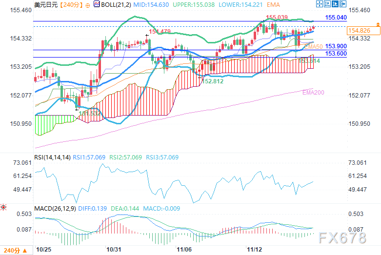 H4(4小时)图显示,美元/日元在10月底大幅上涨后,持续处于横盘整理状态。价格在153.60-155.04区间内波动,围绕布林带中轨形成震荡走势。上轨正逐渐扩大,反映出波动率上升,但目前尚未出现明确的突破动能。