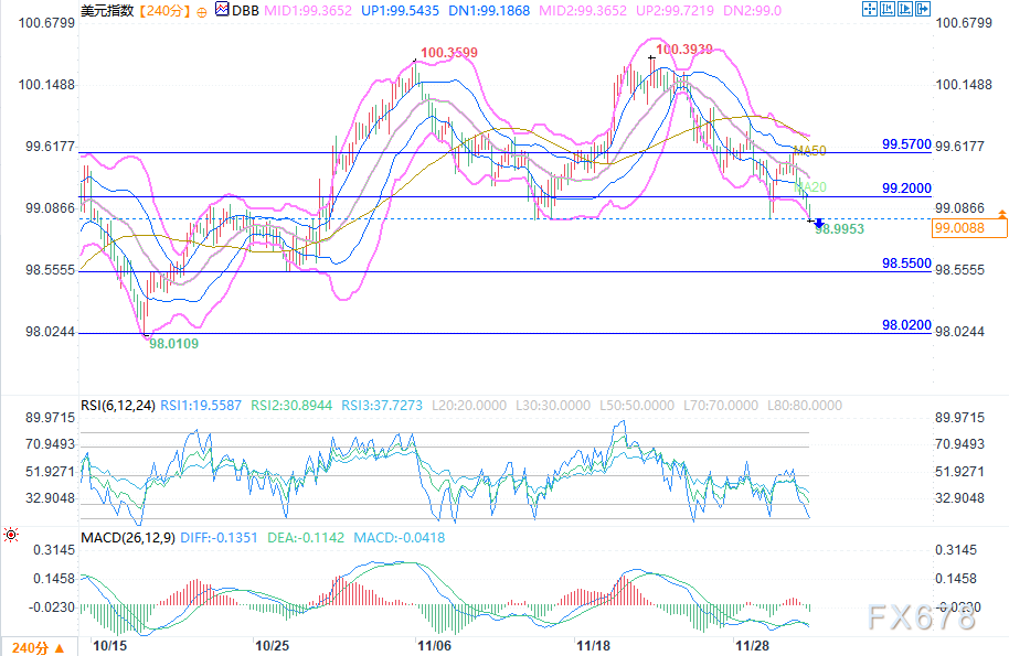 整体而言,美元指数当前处于空头主导的下跌延续阶段,操作上可持有空单并将止损设在99.2(双中轨+MA20阻力位);未入场者可等待价格反弹至99.2附近遇压时做空,目标看向98.55;若价格有效突破99.2并站稳,则需警惕阶段性回调风险。