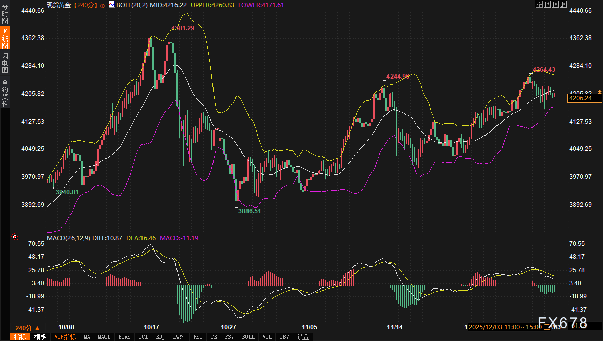现货黄金目前处于一种典型的观望与平衡状态。240分钟图上,金价在布林带中轨4216.18与下轨4171.53之间运行,当前报价略低于中轨。MACD指标显示,DIFF与DEA虽均为正值,但DIFF(10.80)已开始向下收敛靠近DEA(16.45),暗示上行动能正在衰减。短期内,4170-4175美元区域构成了关键技术支撑区间,该区域与布林带下轨及前期震荡平台重合。上方首要阻力则在布林带上轨4260.83美元附近。